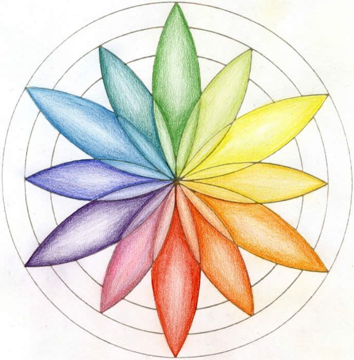 (In de tekening zie je in een mandala de kleuren cirkel verwerkt en de tegen over elkaar liggende kleuren.)