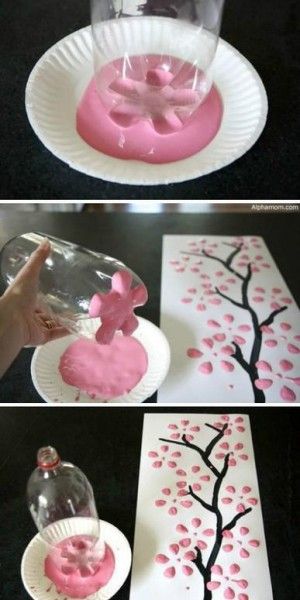 Zet de onderkant van de petfles (de kant waar die op staat) in de roze verf. Zet die daarna bij de takken zodat de afdruk van de verf op het papier komt. (zie afbeelding)